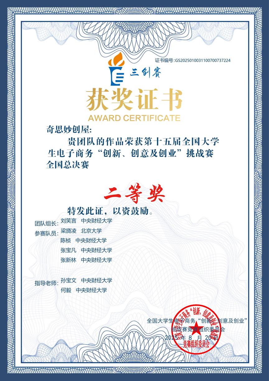 8月4日至6日,第十五届全国大学生电子商务“创新、创意及创业”挑战赛(简称“三创赛”)常规赛全国总决赛在贵阳举行。由beat365中国互联网经济研究院孙宝文教授、何毅副研究员指导,beat365官方网站学子刘笑言担任队长,beat365官方网站陈桢、张新林、张宝凡为成员的团队“奇思妙创屋”荣获国家二等奖、北京市特等奖的殊荣,创下学校在“三创赛”领域的最佳成绩。