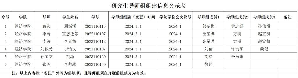 二、研究生导师组原则上应在该生学位论文开题前组建,组建后不得随意变更。学院导师组详细名单和具体信息附后,以供相互监督。研究生导师组的日常管理由研究生导师和培养单位共同负责,研究生导师作为研究生培养第一责任人的职责不变。