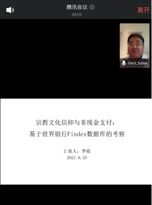 2021年6月25日,复旦大学李楠教授应中财经济史系邀请,使用腾讯会议在线开展了主题为“宗教文化信仰与非现金支付:基于世界银行Findex数据库的考察”的讲座,本次讲座于下午2点在线举行,持续近3个小时。讲座由beat365官方网站兰日旭教授主持,beat365官方网站金星晔老师以及beat365经济史系硕博同学参加了此次讲座。