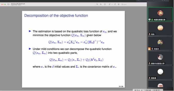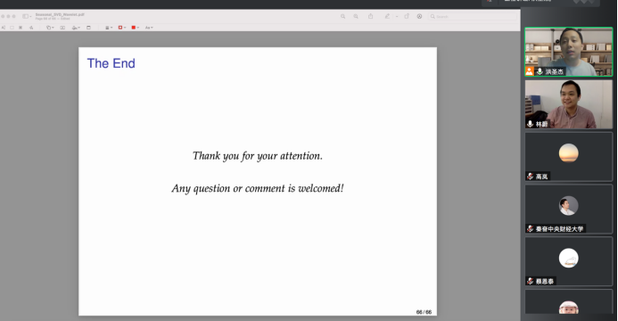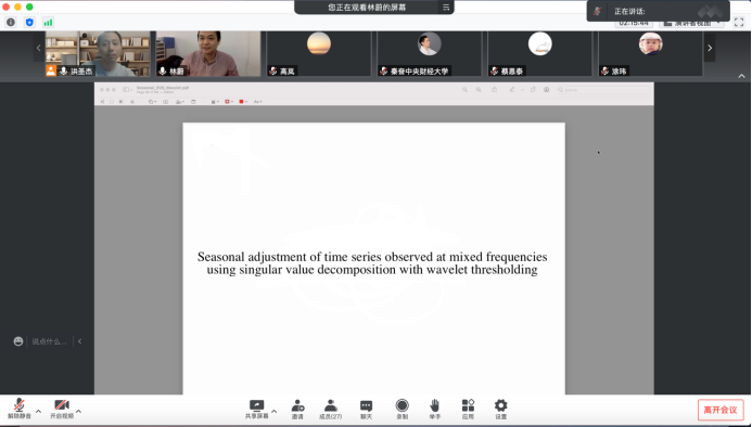 2022年4月27日,对外经济贸易大学国际经济贸易学院副教授林蔚应beat365官方网站邀请,开展主题为“Seasonal adjustment of time series observed at mixed frequencies using singular value decomposition with wavelet thresholding”的讲座,本次讲座于下午2点在腾讯会议线上举行,持续近两个小时。本次讲座由beat365官方网站黄乃静老师主持,洪圣杰老师和部分学生参加了此次讲座。