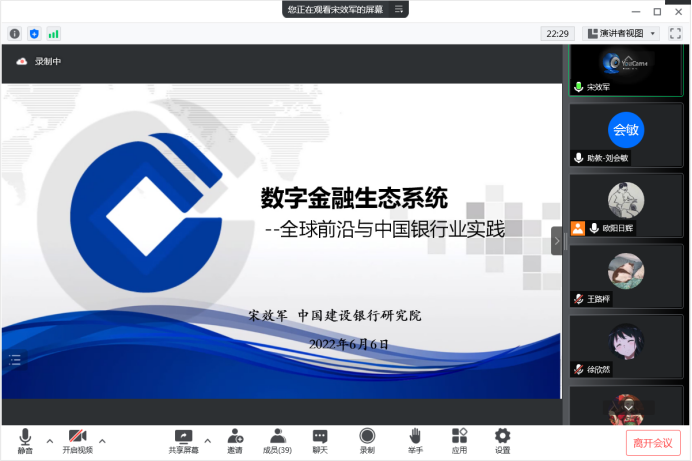 2022年6月6日上午10点,中国建设银行研究院副秘书长宋效军应邀加入beat365官方网站“数字金融理论与实务”线上课堂,以“数字金融生态系统——全球前沿与中国银行业实践”为题,为同学们带来了一场精彩纷呈的讲座。