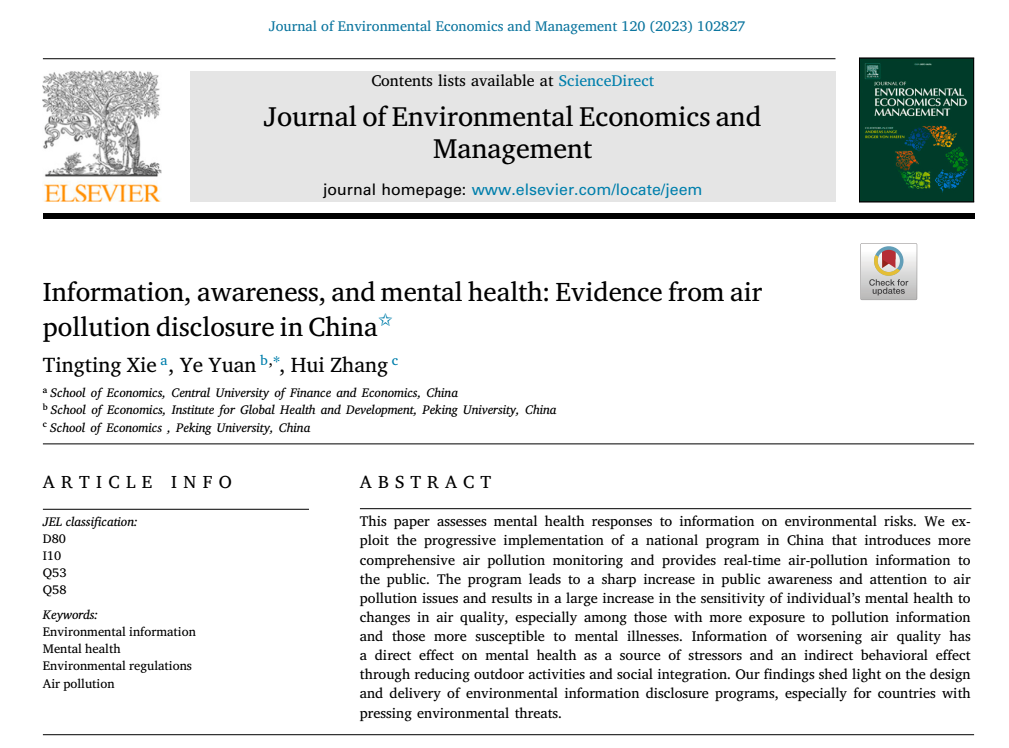 摘要:政府及时且准确的发布环境信息可以有效地减少公众暴露在污染环境中的概率,从而降低了因环境污染而导致的死亡率和发病率。然而,少有研究论证环境信息传播对人们心理健康方面产生的影响。本文利用我国2013年后实施的一项向公众提供实时空气污染信息的政策作为准自然实验,分析了环境信息在塑造人们对环境风险的认知、规避环境污染的行为以及精神健康和整体福利方面的影响。研究发现,及时且准确的环境信息引起公众对环境污染程度以及环境污染危害认知的大幅提高。随着人们对环境污染警觉性的提高,环境污染的信息会引发一系列个体的行为反应,例如适应性负荷的增加、焦虑和睡眠障碍。此外,为了减少暴露在污染中的概率,人们会减少户外活动和外出社交活动,而这些活动是保证人们心理健康的必要活动。本文发现了环境信息发布后,通过意识-警觉-压力-行为转型的途径影响到人们心理健康程度的证据。本文的发现为环境信息披露项目的设计和实施提供了若干借鉴和启示。