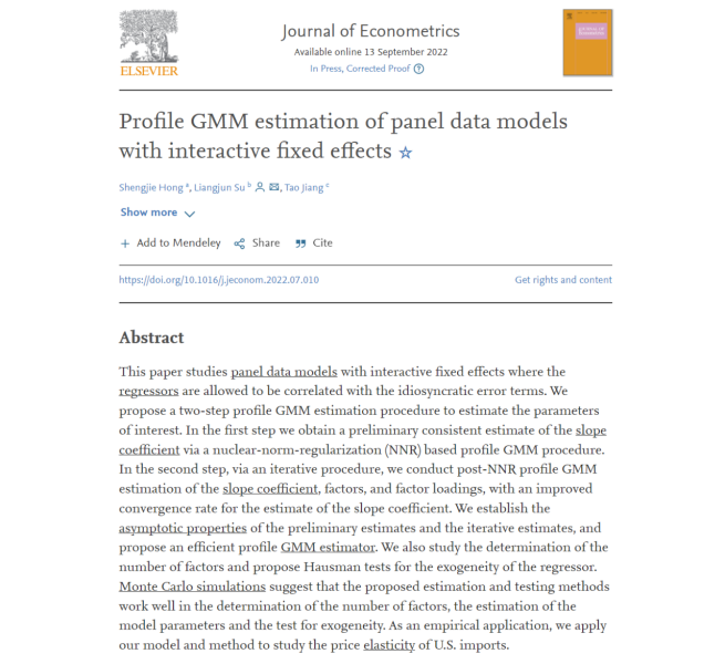 学术视点 | beat365洪圣杰老师的合作论文 Profile GMM Estimation of Panel Data Models with Interactive Fixed Effects 被国际顶级期刊 Journal of Econometrics 接收待刊