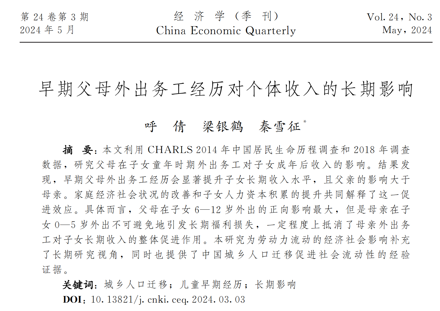 摘要:本文利用CHARLS2014年中国居民生命历程调查和2018年调查数据,研究父母在子女童年时期外出务工对子女成年后收入的影响。结果发现,早期父母外出务工经历会显著提升子女长期收入水平,且父亲的影响大于母亲。家庭经济社会状况的改善和子女人力资本积累的提升共同解释了这一促进效应。具体而言,父母在子女6—12岁外出的正向影响最大,但是母亲在子女0—5岁外出不可避免地引发长期福利损失,一定程度上抵消了母亲外出务工对子女长期收入的整体促进作用。本研究为劳动力流动的经济社会影响补充了长期研究视角,同时也提供了中国城乡人口迁移促进社会流动性的经验证据。