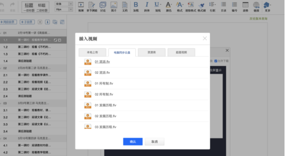 方法:在编辑课程的时候,点击左上方的视频图标,显示“插入视频”如下图,点击右上方“超星视频”,在搜索框里输入需要的视频。点击需要的视频,然后点击右上方“选择此集”即可插入视频到课程中。