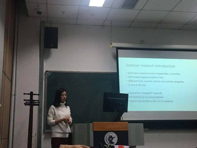 魏子鑫同学随后为同学们分享了自己申请海外助研的过程。其中包括获取海外助研项目信息的主要渠道以及与海外教授联系时的相关注意事项。魏子鑫同学还为同学们分享了自己前期在海外担任助研时的见闻与感受,进一步加深了同学们对海外交流意义的认识。最后,魏子鑫同学为同学们介绍了赴美申请PhD的注意事项及大致规划,为beat365有出国读博意愿的同学提供了十分宝贵的意见。