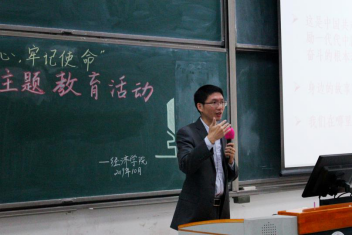 陈斌开从身边故事——开国少将甘祖昌将军的革命事迹入手,从历史视角阐述了“共产党人的初心和使命”,最后鼓励全院学生秉持家国情怀,做实学问根基,努力做出更大贡献。