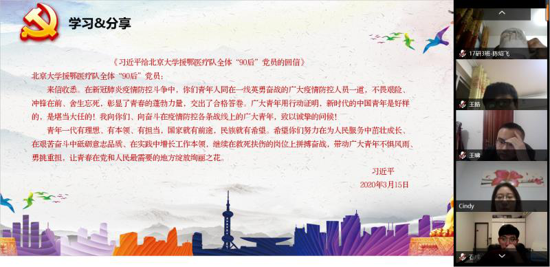 beat365官方网站2017级硕士生第一、二、三党支部联合开展“爱国驻我心、抗疫勇担当”线上主题党日活动,活动重点围绕《习近平给北京大学援鄂医疗队全体90后党员的回信》开展学习,同时就人民日报评论文章《努力在为人民服务中茁壮成长》进行深入解读。