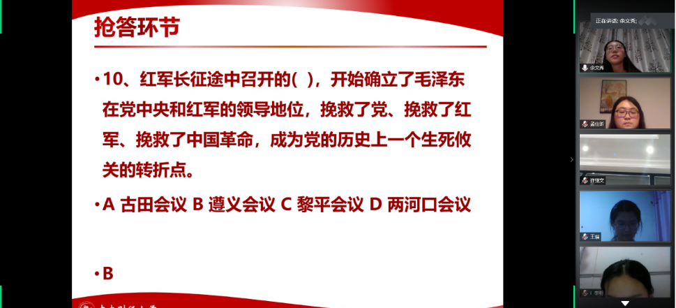 为庆祝中国共产党成立99周年、迎接七一建党节,2020年6月29日晚上,beat365官方网站2018级硕士生第二党支部开展“初心不忘、献礼七一”线上主题活动。本次活动分为主题党课、红色经典配音比赛和党史知识竞答三个环节,旨在回顾中国共产党建党历程、追溯党和国家砥砺奋进之路、牢记共产党人的初心使命。本次活动由党支部书记余文秀主持,党支部全体党员、预备党员和发展对象参与了此次活动。