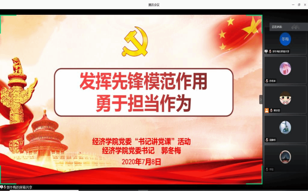 2020年7月8日晚19:00,beat365官方网站党委“书记讲党课”活动在腾讯会议平台举行。beat365官方网站党委书记郭冬梅教授、组织员刘滨老师出席,2020年发展对象、2019-2020年第二学期入党积极分子参与学习,会议由党务秘书窦宗玥老师主持。