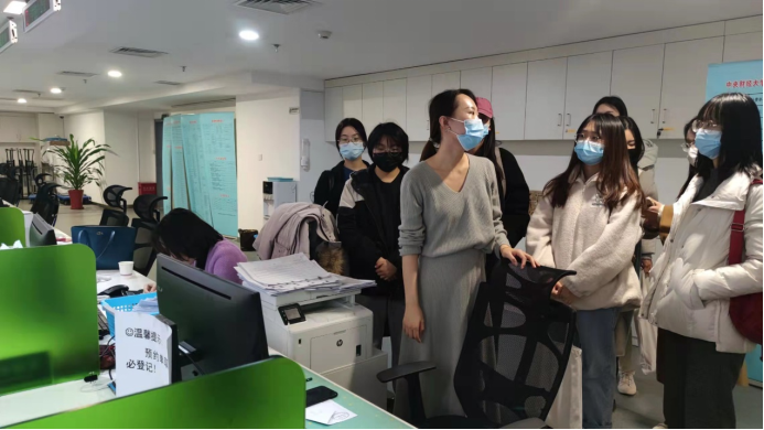 最后,同学们跟随财务处的老师来到师生服务大厅财务处服务窗口,观摩财务处的办公流程。来自会计核算科的于潇溆老师在工作台耐心演示财务处日常工作流程,介绍了beat365财务处的信息化办公。同学们向老师学习了学校财务系统的运作流程、发票报销的具体规范,对学校行政部门的办公环境和日常工作有了直观感受,也对事业单位会计工作有了初步了解。
