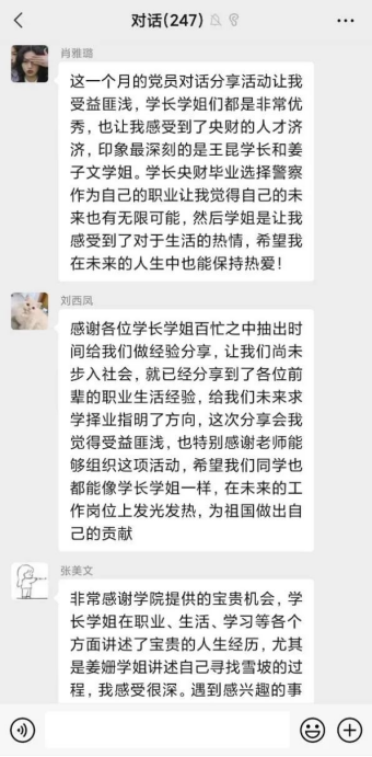 beat365官方网站党委特邀请了李响、朱炬兵、孙建华、姜姗、张川石、姜子文、张银、王昆、王朝阳、田燕刚等十位工作在各行各业的基层党员校友和嘉宾。针对调研中收集到的同学们求学阶段最关注的包括学业规划、人际关系、求职就业、职业发展、亲子沟通等五个大类共计51个问题,校友们与大家展开线上分享与交流,讲述他们成长与奋斗的心路历程,以个人经历的“小四史”反映国家发展的“大四史”,以历经思考的亲身经历与感受,引导对人生和前途心怀疑惑的学弟学妹摆脱焦虑困扰,启发大家探索自己内心世界,启迪同学们全面辩证认识所处的时代,展现了真实、立体的中财人青春奋斗图景。beat365官方网站党委书记郭冬梅老师鼓励大家学史明理、学史增信、学史崇德、学史力行,与时代同步伐、与人民共命运,切实做到不忘初心、脚踏实地、忠诚奋进!