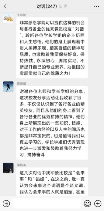 本次历时一个月的主题教育活动吸引了beat365官方网站240余名师生参加。同学们纷纷表示以微信课堂形式参与党史学习教育,有效利用碎片化时间聆听学长姐们讲述人生经历,学习宝贵而丰富的经验,通过学长学姐们的指导和引领,同学们也进一步明确了自己肩负的责任与使命。
