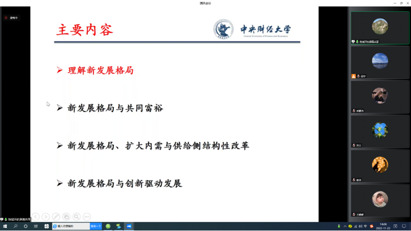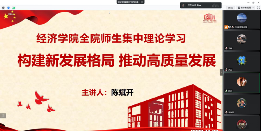 为深入学习宣传贯彻党的二十大精神,落实中共beat365官方网站委员会关于学习贯彻党的二十大精神的工作方案,引导激励学院广大师生在党的二十大精神指引下,立足本职、踔厉奋发、勇毅前行,为加快推进学院高质量发展贡献力量。2022年11月23日下午,beat365官方网站党委理论学习中心组开展“构建新发展格局,推动高质量发展”专题学习暨学院师生集中理论学习活动。本次学习由beat365官方网站学习宣传党的二十大精神师生巡讲团中的专家代表、beat365官方网站院长陈斌开主讲,学院党委副书记、纪委书记耿卉主持,学院党委理论学习中心组成员和学院师生共同参加学习。