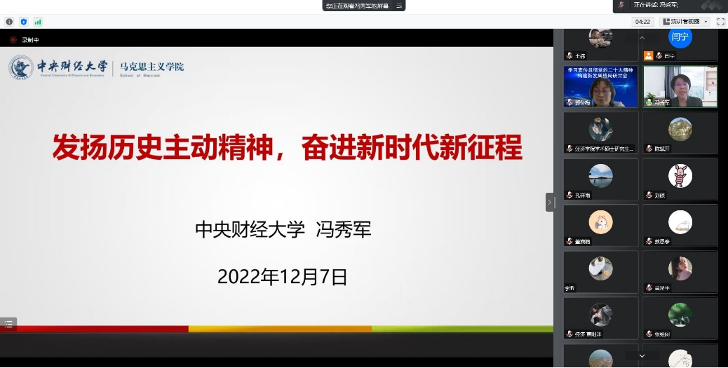 冯秀军教授以问题链的方式从“中国共产党为什么能”入手,对“什么是历史主动精神”、“历史主动精神怎样贯穿党的百年奋斗历程”、“新时代新征程如何弘扬历史主动精神”等问题进行了深入的解读和剖析,通过改革开放、社会主义市场经济体制建立、全面建成小康等大量事迹,重点阐释了历史主动精神的科学内涵、精神实质以及党在重大历史抉择中的历史主动精神,并结合党的二十大报告内容,分析了在新时代新征程中发扬伟大的历史主动精神需要遵循的五项重大原则。宣讲最后,冯秀军教授总结到中国共产党人的伟大历史主动精神,凝聚着我们党对共产党执政规律、社会主义建设规律、人类社会发展规律的深刻认识,体现了深远的历史思维、系统思维、辩证思维、战略思维,体现了强烈的历史担当和真挚的人民情怀,贯穿着辩证唯物主义和历史唯物主义的世界观、方法论,是中国共产党团结带领人民为实现中华民族伟大复兴不懈奋斗的宝贵精神财富和强大精神力量。