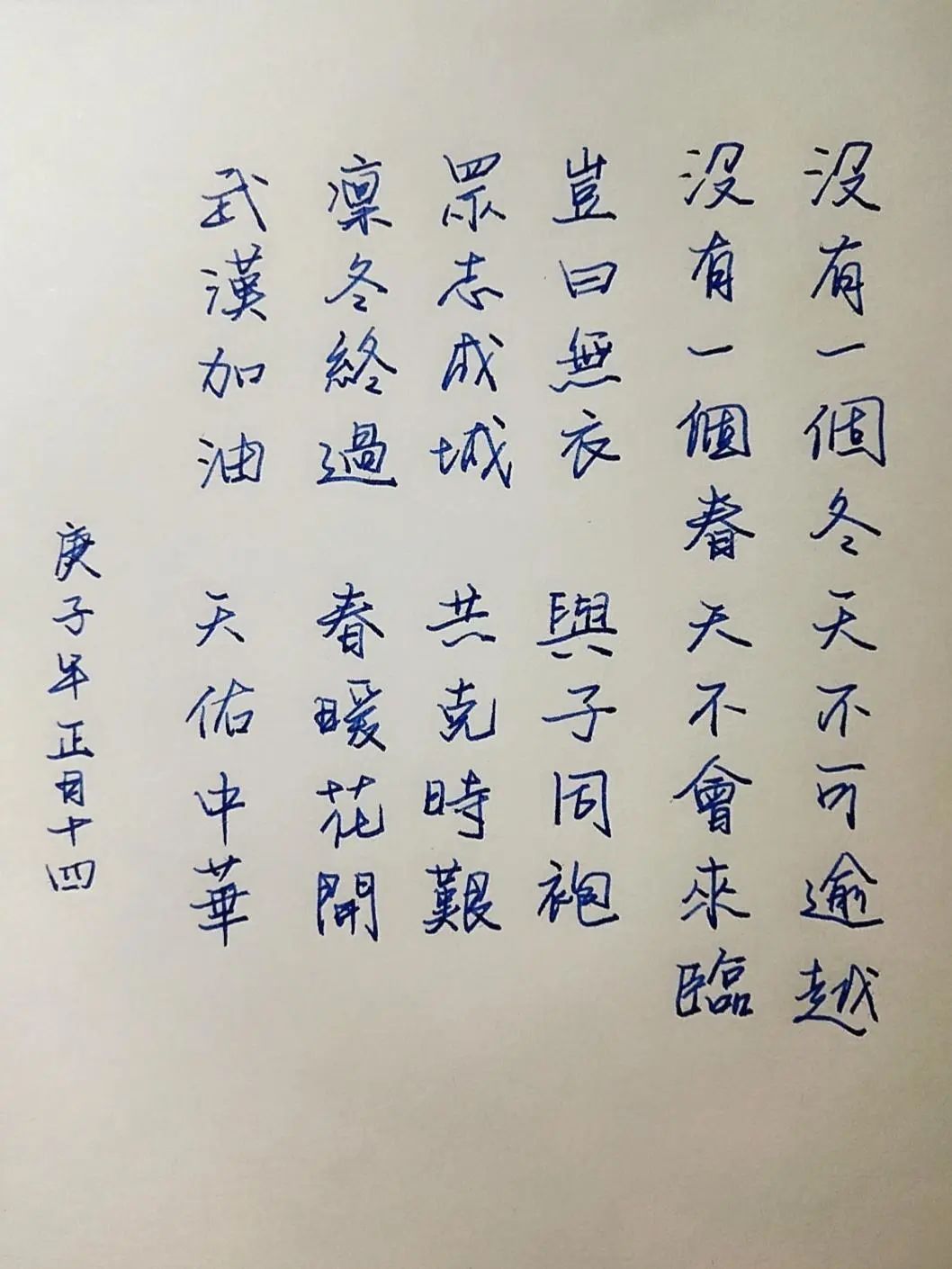 此次活动分为两阶段进行,第一阶段由团员转发“我承诺”做出中财青年团员的表率;第二阶段线上征集原创防疫作品。我班优秀团员宋程瑜率先手写祝福,随后各团员积极响应。鼓励制作原创祝福视频,为这场没有硝烟的战争献上自己的一份祝福。