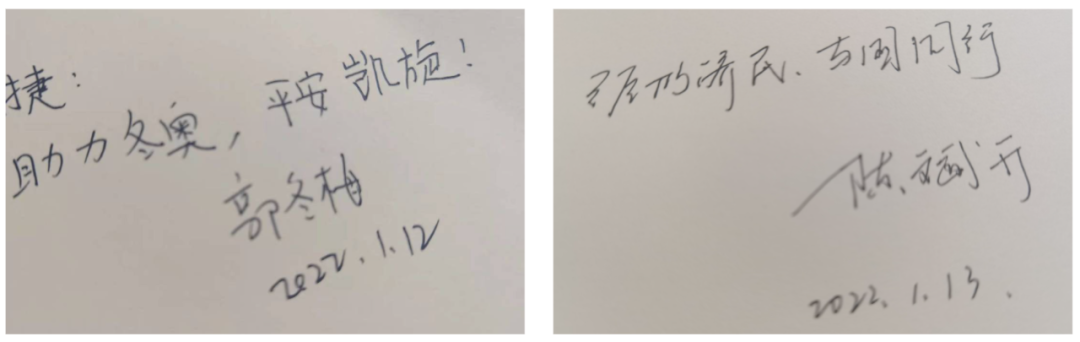 非常感谢学院在我们临行前能为我们办一场“欢送会”,会上老师们对我们的嘱托和期盼让我们感觉到了家的温暖,学院赠予我们的礼物更是非常贴心。在长期的隔离期间,希望我们能够多沟通、多交流,保持乐观积极的心态。在服务中,希望我们能够服从指挥、认真工作,向世界展现出我们中国青年的风采。冬奥如今越来越近了,让我们整装待发,一起向未来!
