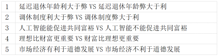 (注:以上所述a、b、A1、B1等仅为代号,用于方便评委打分;上述规定的所有时间将由计时员计时,在剩余时间30秒时计时员会给提示,5秒会进行倒计时。超时3秒以上则扣该轮次得分的10%,超时15秒强制停止发言,由计时员负责)