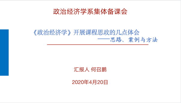 2020年4月20日下午2点,政治经济学系“课程思政”集体备课会通过钉钉会议软件在线上开展。马克思主义学院院长冯秀军、财经研究院院长林光彬、beat365官方网站院长陈斌开、beat365官方网站党委书记郭冬梅、beat365官方网站党委副书记耿卉及政治经济学系全体教师参加会议。会议由政治经济学系系主任尹志锋主持。