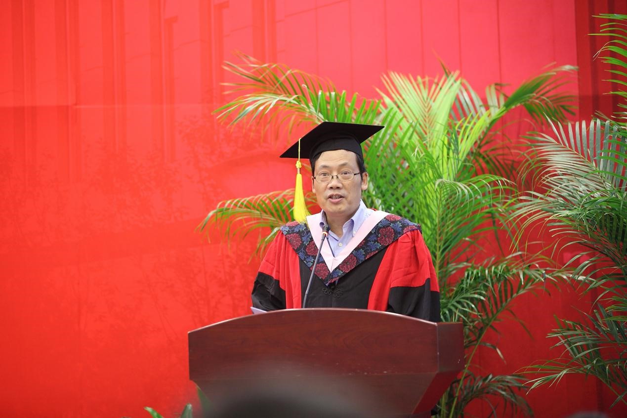 之后,副校长史建平教授为毕业典礼致辞。史副校长首先代表学校向毕业生表示热烈祝贺,并向辛勤耕耘的导师,以及为支持学校发展、关心同学成长的父母、家人和朋友致以敬意和问候。其次,史副校长对第一期商务部援外项目做了回顾与总结,表示该项目进一步提升了beat365对发展中国家人才培养的标准和层次,提升了beat365在财经领域的专业领先地位和国际化水平。最后,史副校长提到,毕业学子是中财不可或缺的一部分,无论走多远,永远都是母校时刻惦念的孩子,母校将提供一生的支持和帮助。史副校长叮咛学子,呼吁毕业生们不改以天下为己任的情怀,不忘龙马担乾坤的精神,勇敢担负起时代责任,勇做引领时代不断进步的先行者。
