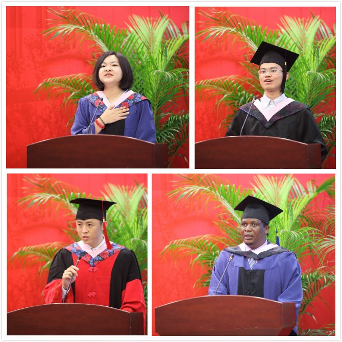 伤离别,千言万语。2015级留学生代表CorneliusKakwesa(科尼思)同学回忆了在中国学习生活的时光,深情表达了对中国、对beat365官方网站以及beat365官方网站的感谢,并表达了对全体留学生顺利完成硕士学业的祝贺。来自2013级经济专业的李嘉晟作为本科生代表,回顾了在beat365官方网站走过的路,有感恩、有学习、有进取,表白经济13是“一生的眷恋”,他说“人生是一场马拉松,keep running,just running,我们都会到达属于我们各自的终点和彼岸”。2015级硕士毕业生代表李进展分享了在beat365官方网站两年的成长,表达了对导师、父母亲朋以及同窗的感恩,追忆与同学们相处的细节,同时抒发了“莫愁前路无知己,天下谁人不识君”的豪迈情怀。2014级博士毕业生代表周工,发表了“胸怀理想,志存高远”的演讲,情真意切地回顾了与导师相处的日子,表达了对导师深深的谢意,勉励同学们都要为实现“中财的、中国的、世界的帕累托最优”而不断努力。
