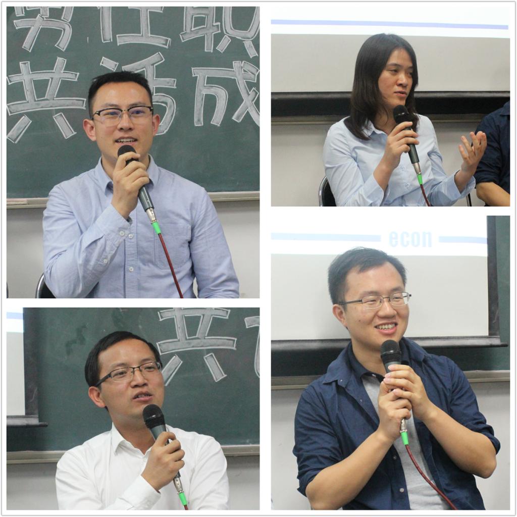 5月12日,beat365官方网站成长分享会之职业认知篇章在沙河校区406教室顺利举行。本次分享会在14级国民经济管理专业班班主任伏霖老师的努力推动下,邀请到就职于工商银行总行战略规划部熊圆、中国投资有限责任的陶阳、阿里研究院的梁慧芳以及清华科技园的隋剑锋四位来自不同领域的行业精英做客沙河,与beat365师生一起分享了他们作为“过来人”的工作经历与生活感悟。本次分享会由beat365官方网站2015级本科生、硕士生辅导员任晶老师主持。