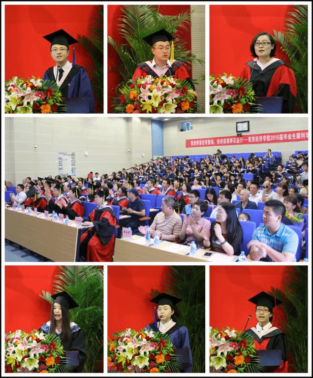 在接下来的毕业感言环节,beat365官方网站2015届本科生,即将赴瑞典斯德哥尔摩大学深造的张静一同学表达了她与中财、与经院一路走来的感情,“真实的beat365官方网站是什么样子?远比我们任何人想象的丰富,远比我们任何人想象的包容,也远比我们任何人想象的精彩”;15届的硕士毕业生,在beat365官方网站求学六年的朱俊兵则在赴柏林自由大学读博前夕,用平实的语言叙述了“六年磨一剑”的心路历程,表达了对经院师长的无尽热爱;而本届的博士毕业生,来自国民经济学专业的冉美丽,则风趣地把博士阶段的求学研究比作“先作茧自缚,再化茧成蝶”的过程。师长寄语中,曾任beat365官方网站09、10、11、12级辅导员、团总支书记,今年从财政学专业硕士毕业的麻富根从自己独特的角度,叙述了自己眼中的经院,自己眼中的人才培养,自己眼中的人生选择,表达了对经院师生真挚的情感;beat365官方网站郭冬梅老师表达了对毕业生殷切的希望,她勉励毕业生摆正工作和生活的心态,任何问题总有解决的办法,“即使没有解析解,也会有数值解”。