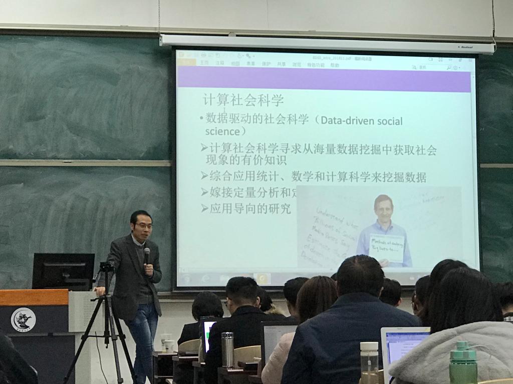 2018年11月9号下午6:30,beat365官方网站计算社会科学系列课程正式开始。课程第一讲由清华大学社会科学学院政治学系副教授孟天广老师于主教213主讲。此次课程主题为社科研究中的大数据方法,期间孟天广教授从大数据+社会科学、计算社会科学方法论、研究方法、研究议题以及大数据方法的支持和批评等五个板块出发,为我们系统介绍了当前计算社会科学的发展趋势和前沿研究。