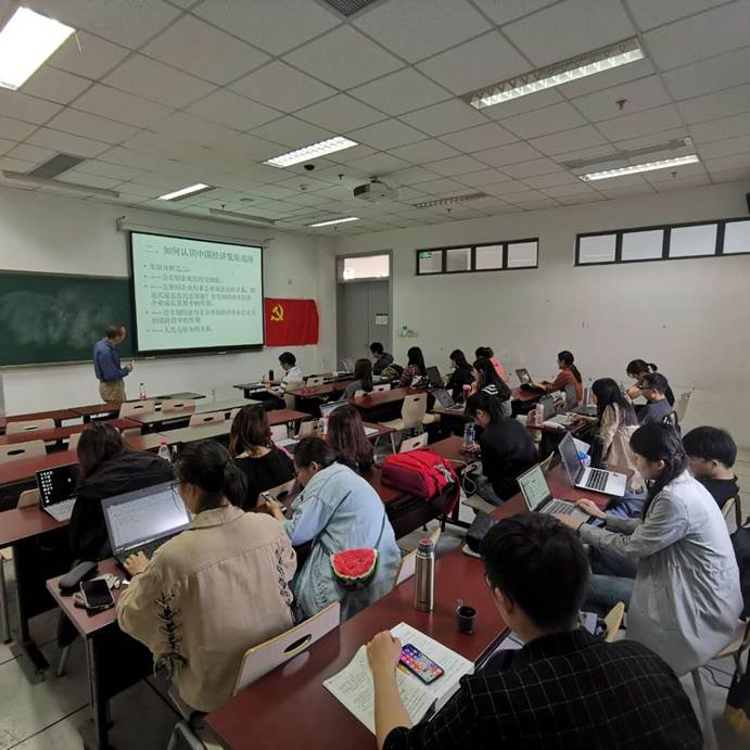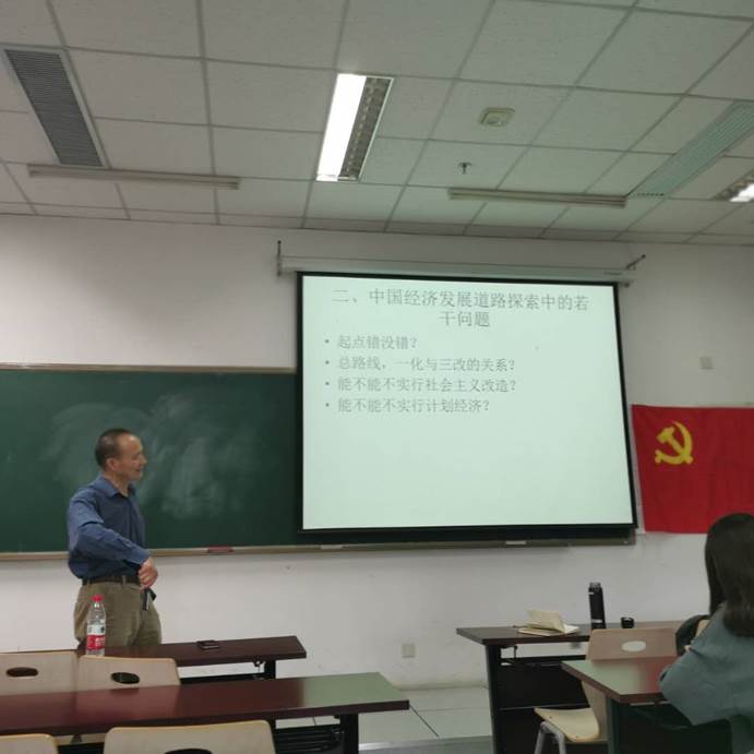 讲座最后,郑老师同参加讲座的老师、同学们展开了热烈的讨论。讲座现场气氛活跃、在座师生受益匪浅,大家对中国经济发展道路的选择有了更深刻的理解和认识。郑老师给出了更多有关材料供同学们继续思考:《公有制的建立是新中国经济发展奇迹的基石——基于社会主义改造历史地位的分析》、《中华人民共和国经济史(1949-2012)》、《中国特色社会主义政治经济学中的中国共产党、人民、资本》、《文化自信不能泛化》等。