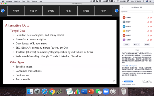 在课程讲授结束后,修教授热情、耐心地解答了专家学者与师生的提问,并分享了目前有关机器学习方法在经济金融研究的最新动态和潜在研究方向。最后,黄乃静老师对课程进行简要总结和点评,并向修大成教授的辛勤教学表示感谢。参与课程的师生纷纷表示修老师讲课形象生动,课程内容详尽,受益匪浅。