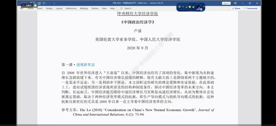 2020年9月23日-2020年9月28日,伦敦大学亚非学院(SOAS)教授卢荻应beat365官方网站邀请,使用腾讯会议APP开展主题为“中国政治经济学”的讲座,本次讲座分为三部分:第一课“透视新常态;第二课“审视国企——‘退出、呼吁与忠诚’”;第三课“‘走出去’与世界范围的后进发展”。本次讲座由beat365官方网站副院长赵文哲老师主持,beat365官方网站部分师生及校外同学参加了此次讲座。