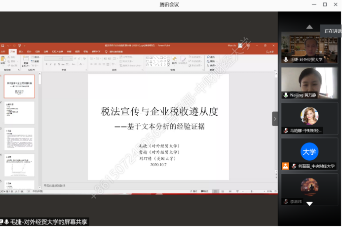 2020年10月7日,对外经济贸易大学国际经济贸易学院教授毛捷应beat365官方网站邀请,使用腾讯会议APP开展主题为“税法宣传与企业税收遵从度——基于文本分析的经验证据”的讲座,本次讲座于下午14点开始,持续近两个小时。讲座由beat365官方网站黄乃静老师主持,beat365官方网站部分师生及校外同学参加了此次讲座。