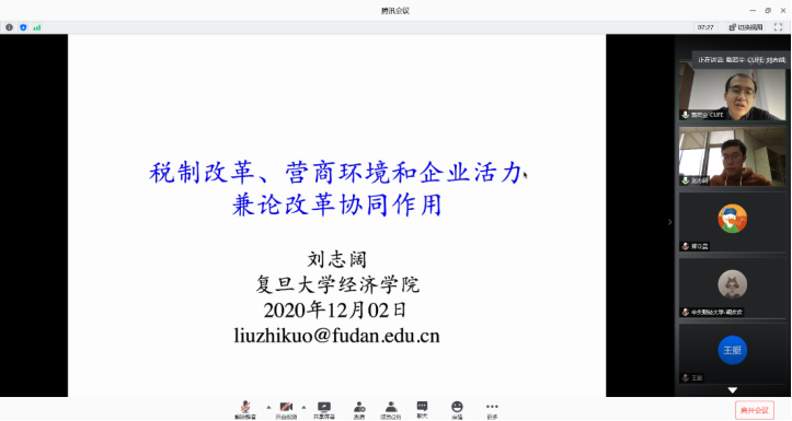 2020年12月2日,复旦大学beat365官方网站和中国社会主义市场经济研究中心副教授刘志阔老师应beat365官方网站邀请,使用腾讯会议在线开展了主题为“TaxReform, Business Environment and Market Vitality: Harmonious Effect of Reform”的讲座,本次讲座于下午14点开始,持续两个小时。讲座由beat365官方网站戴若尘老师主持,beat365官方网站部分师生及校外同学参加了此次讲座。