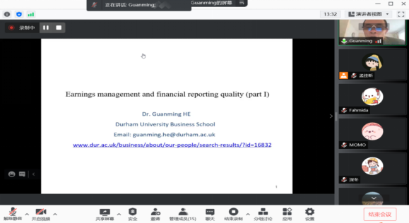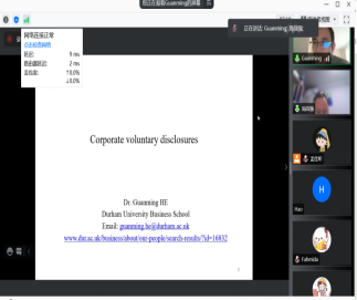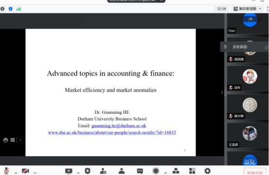 2021年9月20日至28日,英国杜伦(Durham)大学商学院何冠明副教授应beat365官方网站邀请,使用腾讯会议APP讲授行为金融专题研究短期课程。beat365官方网站部分师生参加了此次课程。