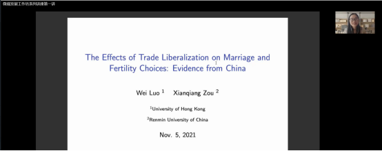 2021年11月5日下午,beat365官方网站微观发展工作坊系列讲座第一讲在线上顺利举行。本次讲座的主题是贸易自由化对婚姻和生育选择的影响,由香港大学经管学院博士后研究员罗唯老师主讲,beat365beat365官方网站的赵文哲老师、胡志安老师、梁银鹤老师、徐竹烽老师以及中国人民大学劳动人事学院的邹先强老师参与了讲座。