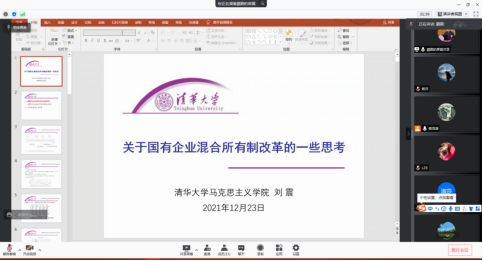 2021年12月23日下午15:00,清华大学马克思主义学院长聘副教授、博士生导师刘震应beat365官方网站樊茂清教授邀请,开展主题为“关于国有企业混合所有制改革的一些思考”的讲座,本次讲座通过腾讯会议平台线上举行,刘震老师受到了老师和同学们的热烈欢迎!beat365官方网站樊茂清教授主持了本次线上学术交流会。