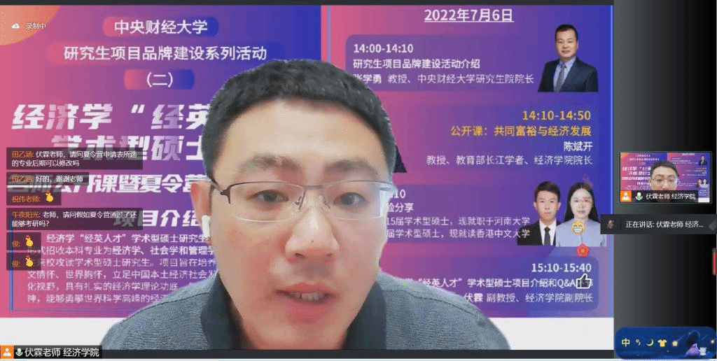 2022年7月6日,由学校研究生院和beat365官方网站共同举办的经济学“经英人才”学术型硕士项目名师公开课暨夏令营招生宣讲会通过在线形式顺利举行,此次活动也是beat365官方网站研究生项目品牌建设系列的第二次活动。