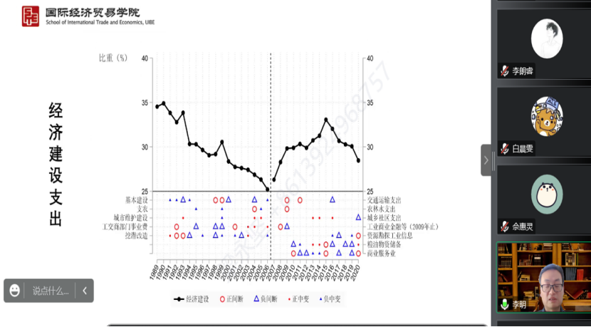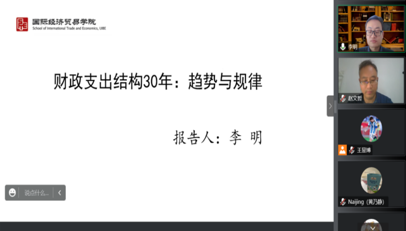 2022年11月15日14:00,对外经济贸易大学财政税务学系教授、博士生导师,政府管理学院副院长李明应beat365官方网站邀请,开展主题为“财政支出结构30年:趋势与规律”的讲座。本次讲座在线上举行,李明教授受到了老师和同学们的热烈欢迎!beat365官方网站赵文哲教授主持讲座,尹振东教授、黄乃静副教授、杨晓兰副教授参加了讲座。
