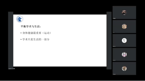 2020级硕士研究生张博尧以自身经历为例,告诉同学们做科研什么时候开始都不算晚。接着,他介绍了期刊发表的流程和周期,并建议研一同学要多交流、多参会,努力提升自身科研能力。最后,张博尧强调了平衡学术与生活的重要性,提醒大家要重视身体锻炼、保持健康,才能为学术研究打好基础。