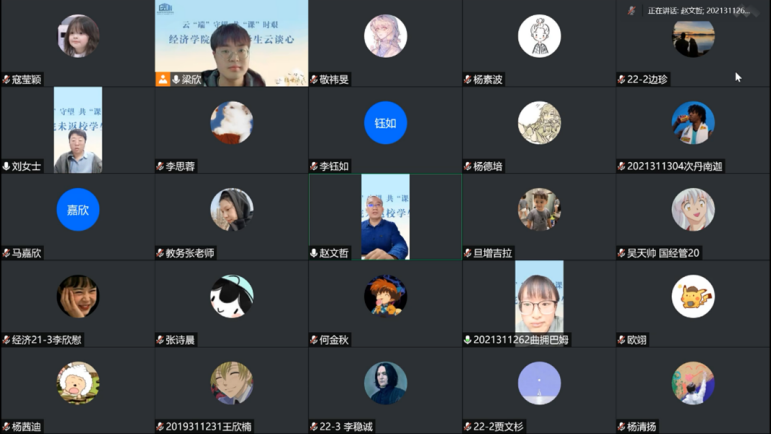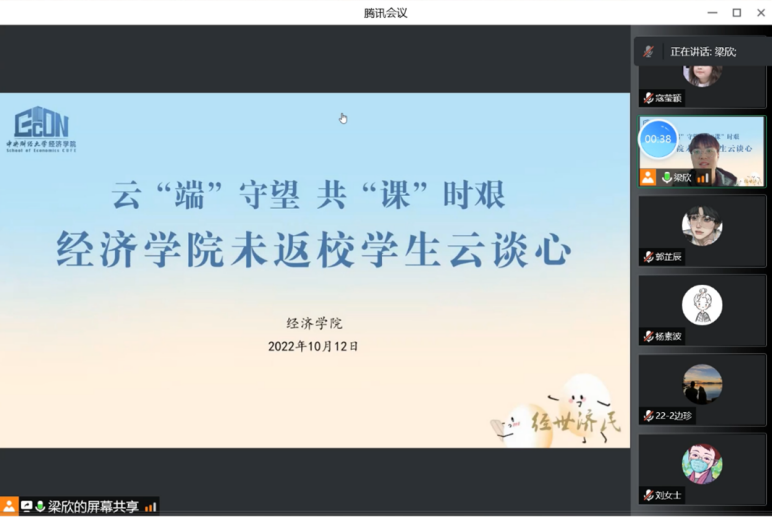 共克时艰携手前行,云端助力经心相守。为深入了解未返校同学们的思想、学习、生活状态,积极引导同学们树立积极乐观的心态,解决学生实际困难,经济于2022年10月12日15:00线上举办了云“端”守望,共“课时艰”——beat365官方网站未返校学生“云谈心”活动。学院副院长赵文哲,学院党委副书记耿卉,组织员刘滨,本科教务干事张珏,22级本科生辅导员任晶,学院团委兼职副书记、21级本科生班主任何金秋,学院团委副书记、20级本科生辅导员梁欣,未返校本科生和校内对接志愿者一起在线上充分沟通交流。