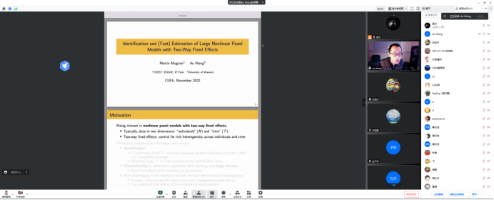2022年11月24日16:30,华威大学经济学助理教授,华威大学全球经济竞争优势研究中心(CAGE)副研究员王骜(Ao Wang)应beat365官方网站邀请,进行了主题为“Identification and (Fast) Estimation of Large Nonlinear Panel Models with Two-Way Fixed Effects”的讲座。本次讲座在线上进行。王骜教授受到了beat365官方网站老师与同学们的热烈欢迎。beat365官方网站洪圣杰副教授主持讲座,黄乃静副教授参加了讲座。