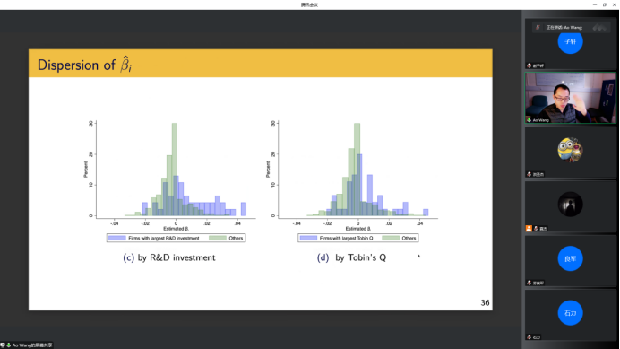 最后,王骜教授利用该方法研究两个现实问题。首先研究不同国家进出口贸易弹性的差异,结果表明,进出口贸易弹性的均值与分布是有显著差异的,且不同国家的一些特征(如是否加入世贸组织、地理位置等)部分解释了这一差异。其次,研究不同企业对机构所有权变更的异质性反应,结果表明,创新能力更强的公司有着更为积极的反应。王骜教授在讲座最后对文章进行了总结,认为这种新的Gauss-Seidel迭代法对长期面板数据的处理提供很大便利。