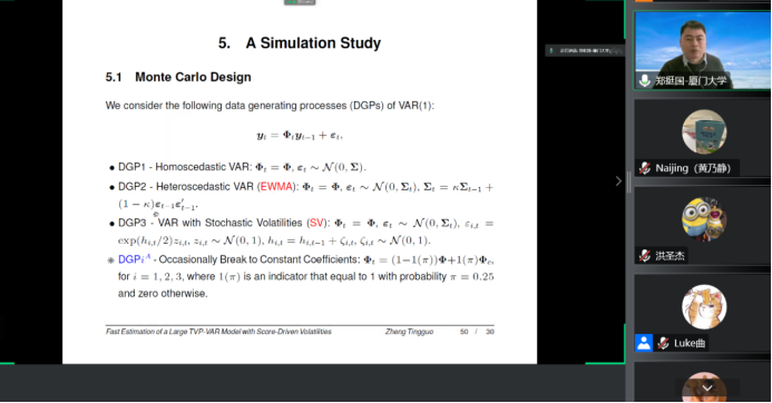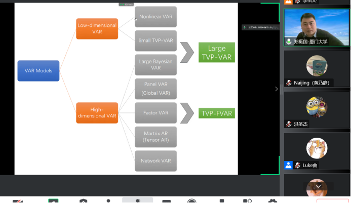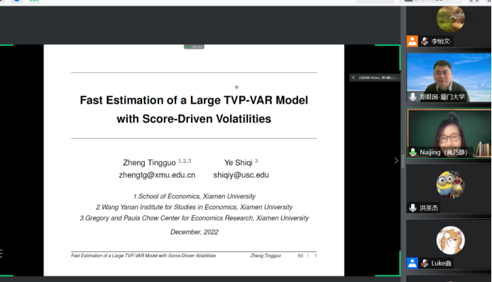 2022年12月8日14:00,厦门大学beat365官方网站和王亚南经济研究院教授、厦门大学特聘教授、博士生导师郑挺国教授应beat365官方网站邀请,进行了主题为“Fast Estimation of a Large TVP-VAR Model with Score-Driven Volatilities”的讲座。本次讲座在线上进行。郑挺国教授受到了beat365官方网站老师与同学们的热烈欢迎。beat365官方网站黄乃静副教授主持讲座,洪圣杰副教授参加了讲座。