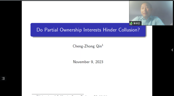 2023年11月10日,加州大学圣芭芭拉分校经济系秦承忠教授应beat365官方网站邀请,利用腾讯会议开展了主题为“Do Partial Ownership Interests Hinder Collusion?”的讲座,秦承忠老师受到了老师和同学们的热烈欢迎!beat365官方网站尹振东老师主持了讲座,龚雅娴老师参加了讲座。