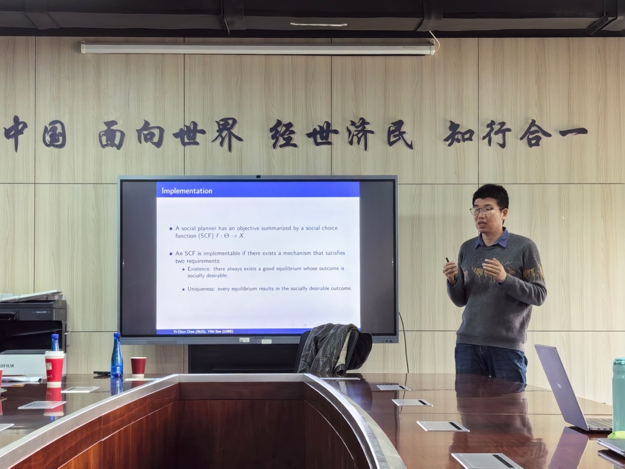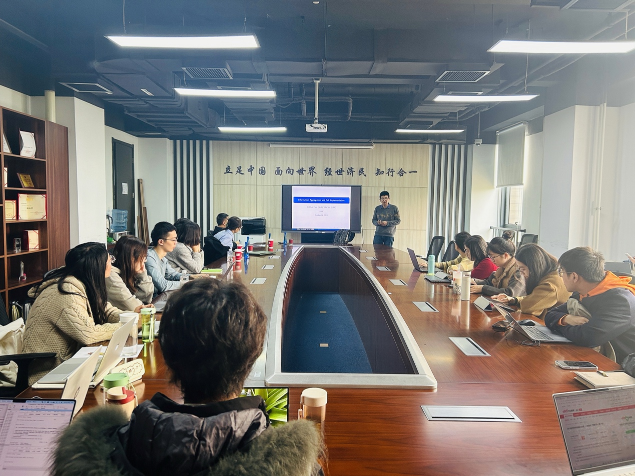 2024年10月25日下午,对外经济贸易大学经济学系孙一飞教授应邀为beat365师生主讲“Full Implementation and Information Aggregation”讲座,讲座于学院楼11号楼308会议室举行。beat365官方网站龚雅娴副教授主持讲座,张志祥、李东阳等多位校内老师和三十余名同学参加了此次讲座。