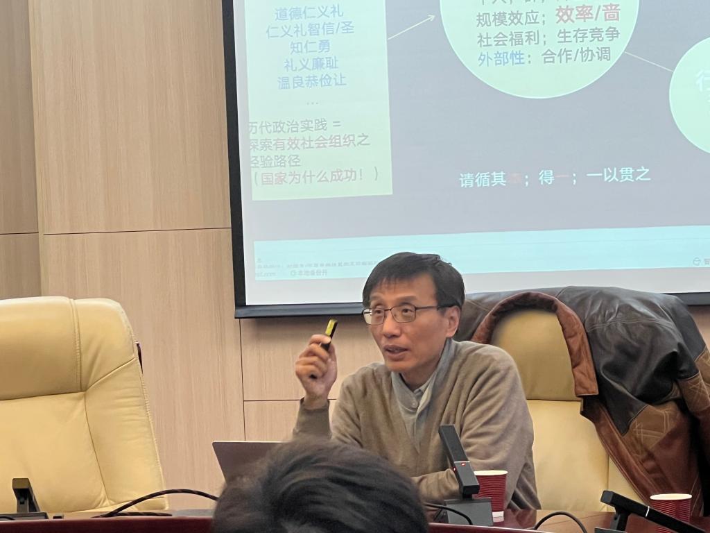 在问答环节,翟颖佳、吴楠、赵扶扬老师分别就儒家宗法社会的特定背景、道德伦理体系在经济学视角所对应的社会偏好、德本思想在外部性存在条件下的具体作用等问题与杨教授进行了深入交流,杨教授逐一从“礼治”的本质、社会福利最大化与德的关系、社会机制设计等方面耐心回应。