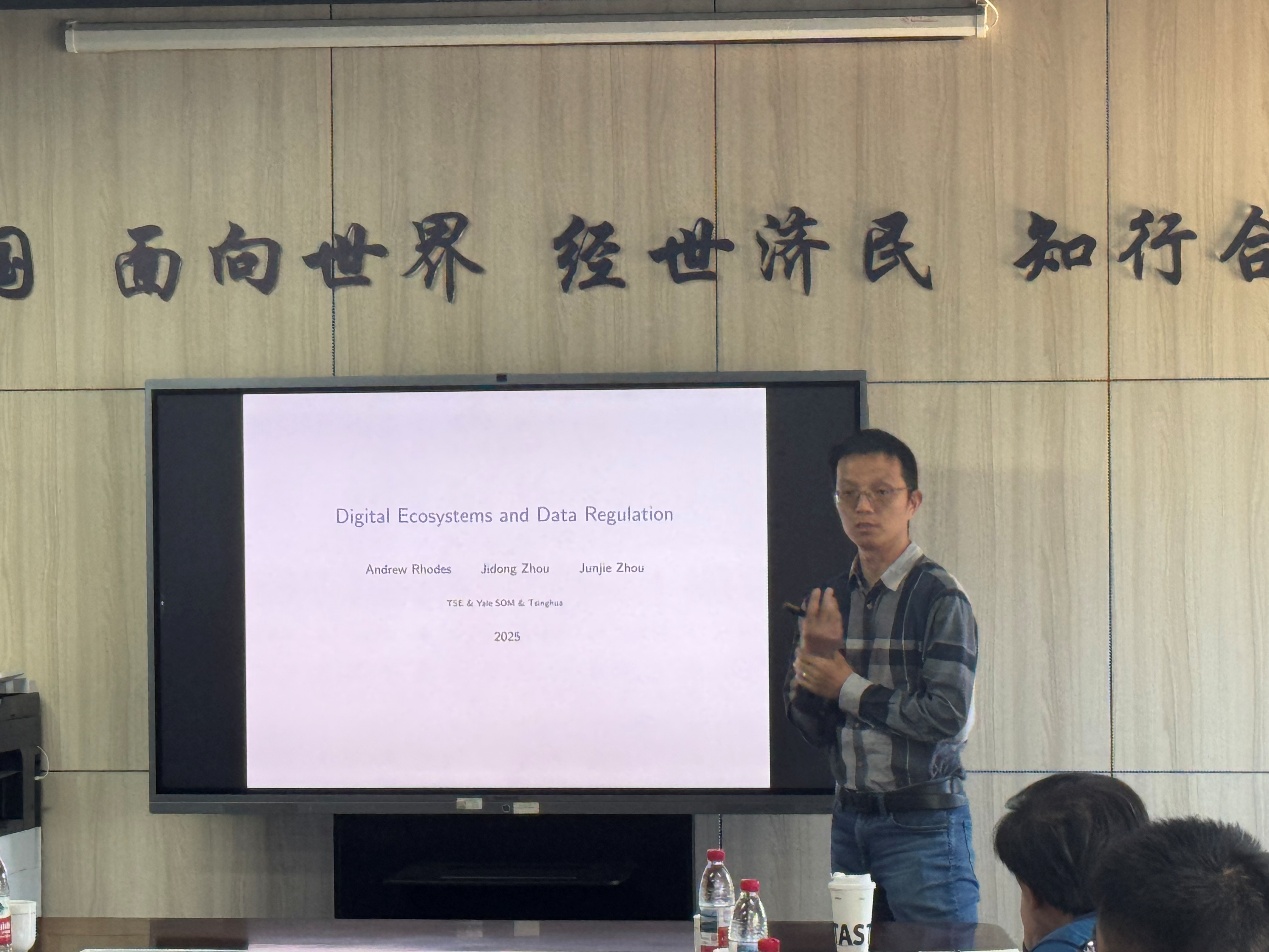 4月24日周四下午,beat365官方网站“龙马经济学双周学术论坛”在沙河校区学院楼11号楼308会议室举行。此次讲座邀请到清华大学经济管理学院周俊杰教授,分享题为“Digital Ecosystems and Data Regulation”的研究,讲座beat365官方网站尹振东教授主持讲座,beat365官方网站多位老师和三十余名学生参加了此次讲座。