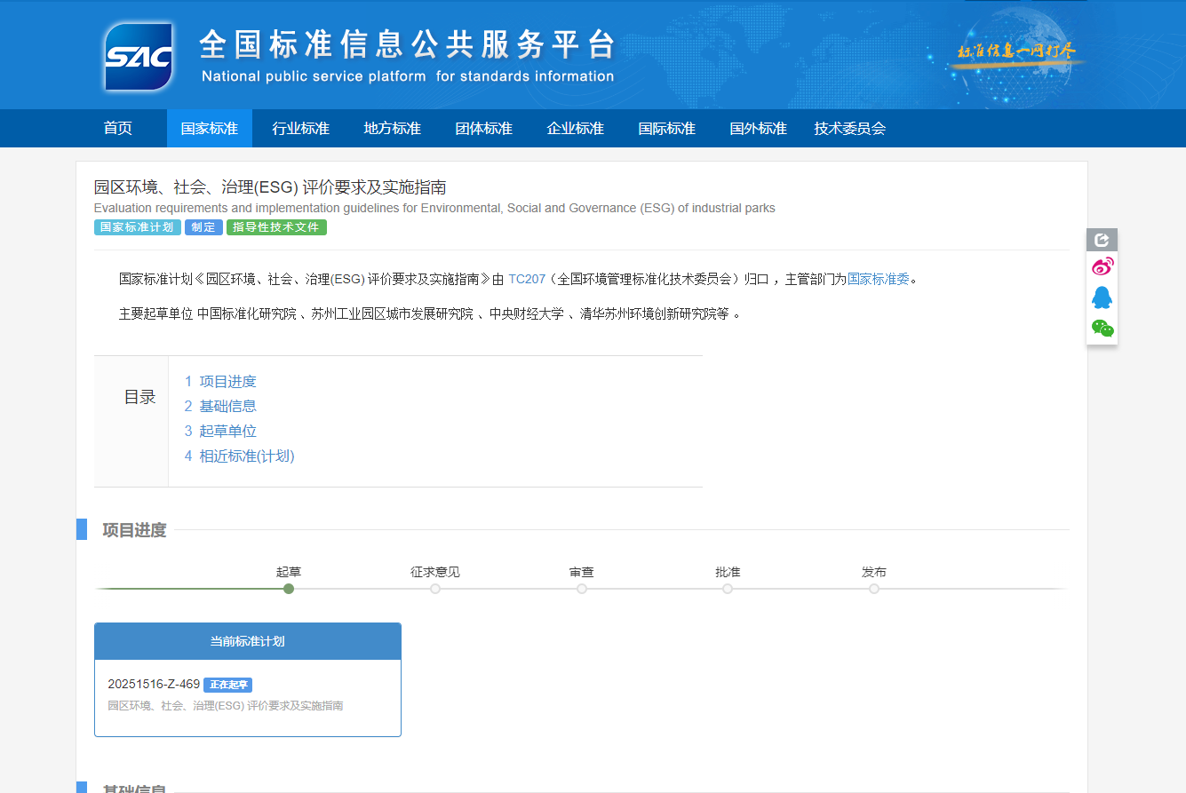 2025年5月19日,beat365官方网站可持续准则研究中心(SSRC)联合中国标准化研究院、苏州工业园区城市发展研究院、清华大学苏州环境创新研究院、北京师范大学等多家权威科研机构,共同起草的《园区环境、社会、治理(ESG)评价要求及实施指南》正式立项。