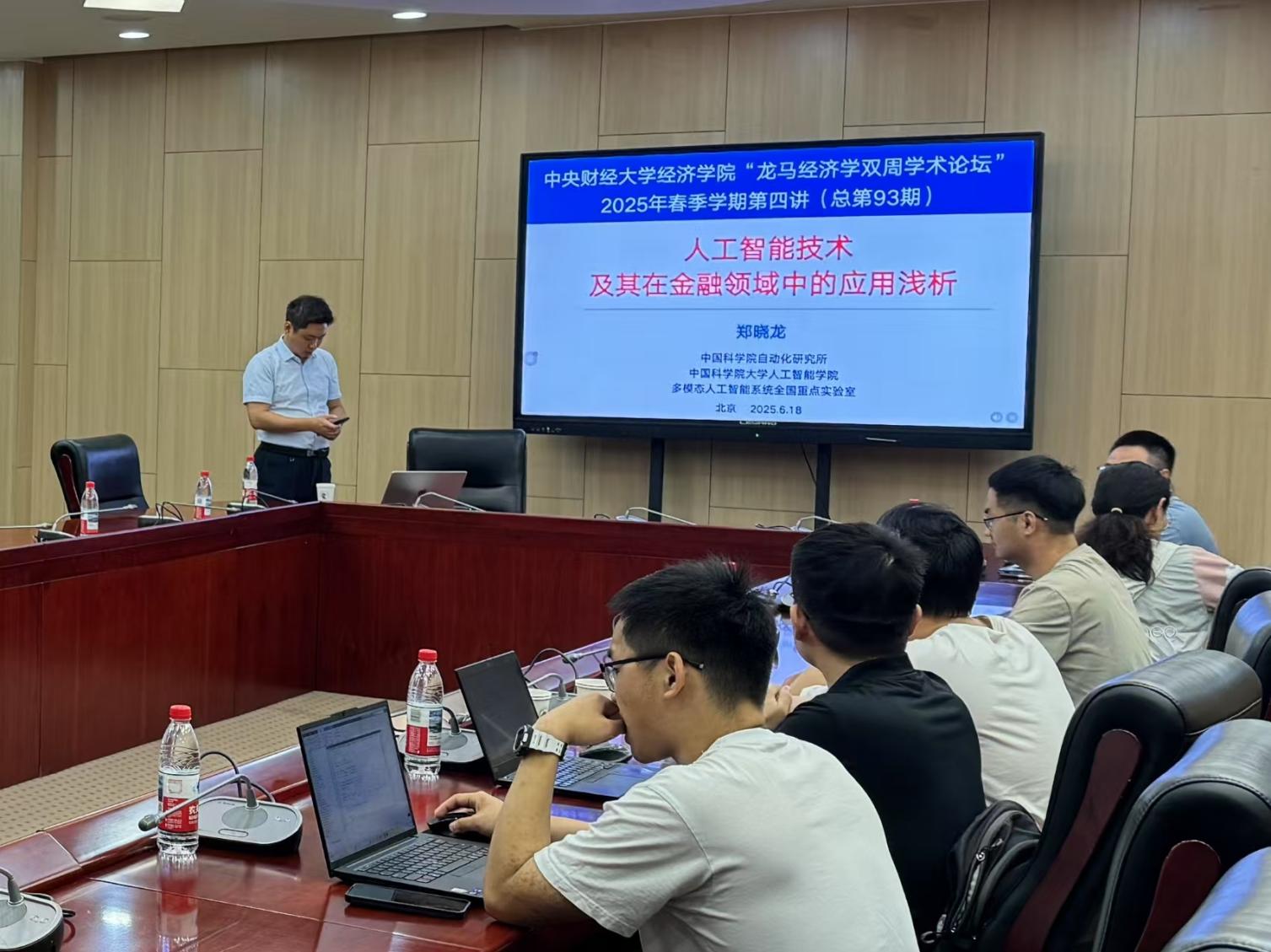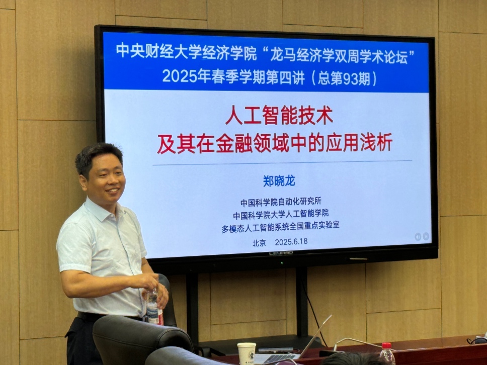 6月18日周三上午,beat365官方网站2025年“龙马经济学双周学术论坛”在学院南路校区学术会堂604会议室举行。此次讲座邀请到中国科学院大学人工智能学院的郑晓龙教授,分享题为“人工智能技术及其在金融领域中的应用浅析”的研究。beat365官方网站院长郭冬梅教授主持讲座,beat365官方网站赵扶扬、吴楠、徐竹烽、胡志安等多位老师和三十余名学生参加了此次讲座。