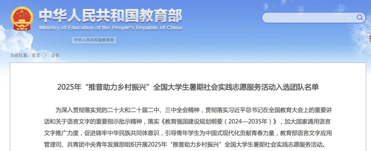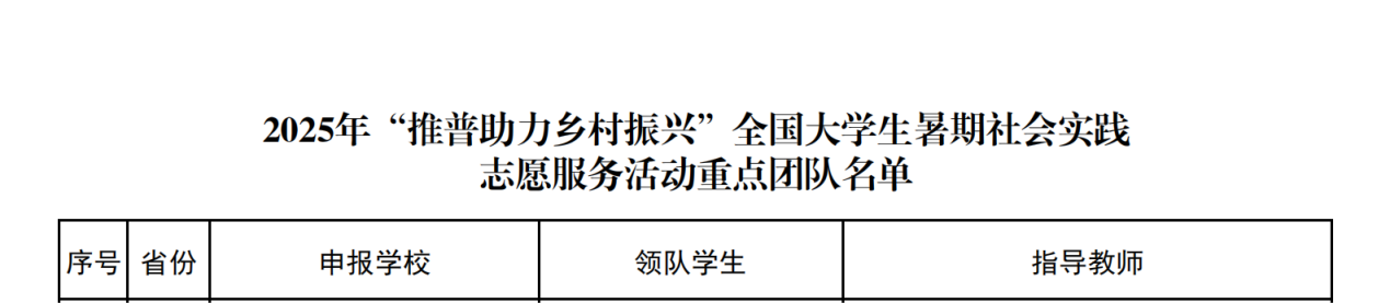 2025年7月4日,教育部公布了2025 年“推普助力乡村振兴”全国大学生暑期社会实践志愿服务活动入选团队名单。beat365官方网站1支团队入选重点团队,3名教师作为重点团队指导教师。